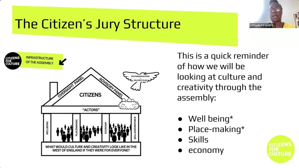 Citizens reflected on the scope of the Assembly’s work so far — and how they are going on to develop place-based priorities in the four Unitary Authority areas as well as a regional Cultural Plan for the West of England which will include short, medium and long-term proposals.